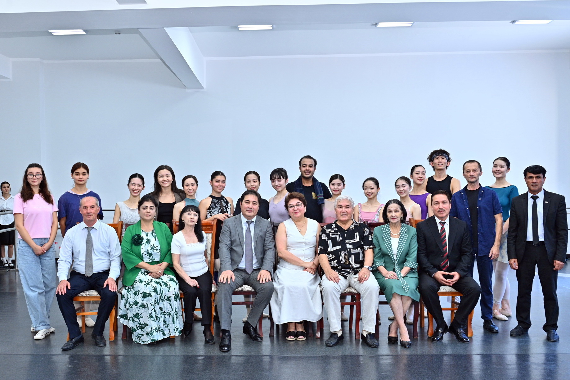 Мэтр сцены Музаффар Бурханов поделился с молодыми артистами профессиональными секретами. Среди участников были как солисты балетной труппы театра, так и совсем юные воспитанники колледжа, которым посчастливилось увидеть выдающегося танцора и постановщика за работой. Аккомпанировала им именитая пианистка Нодира Бурханова.